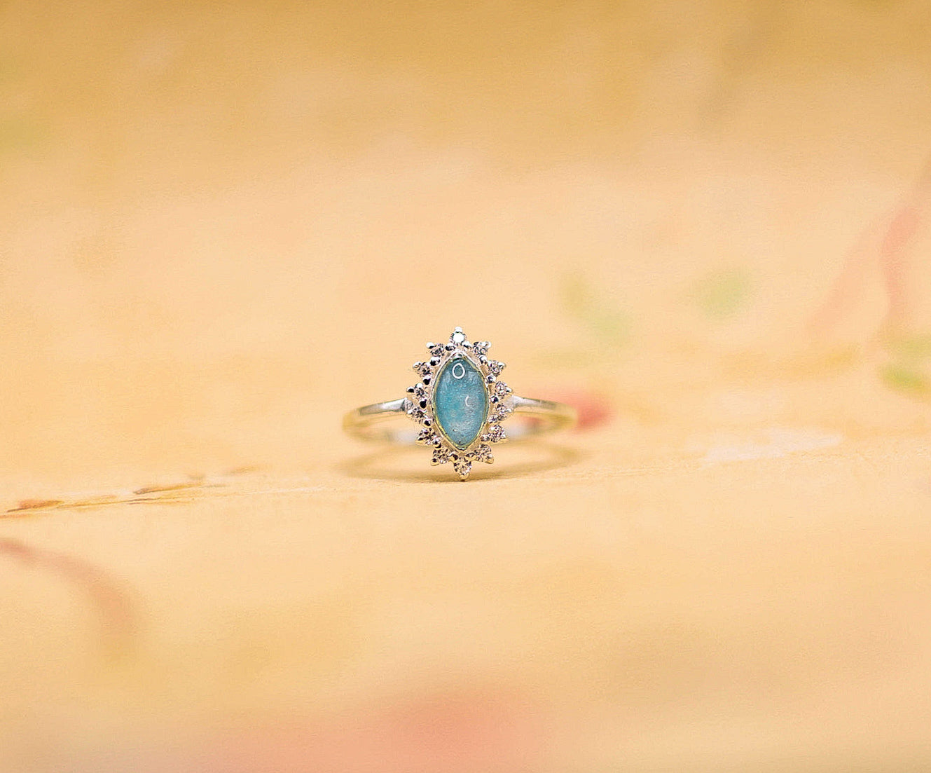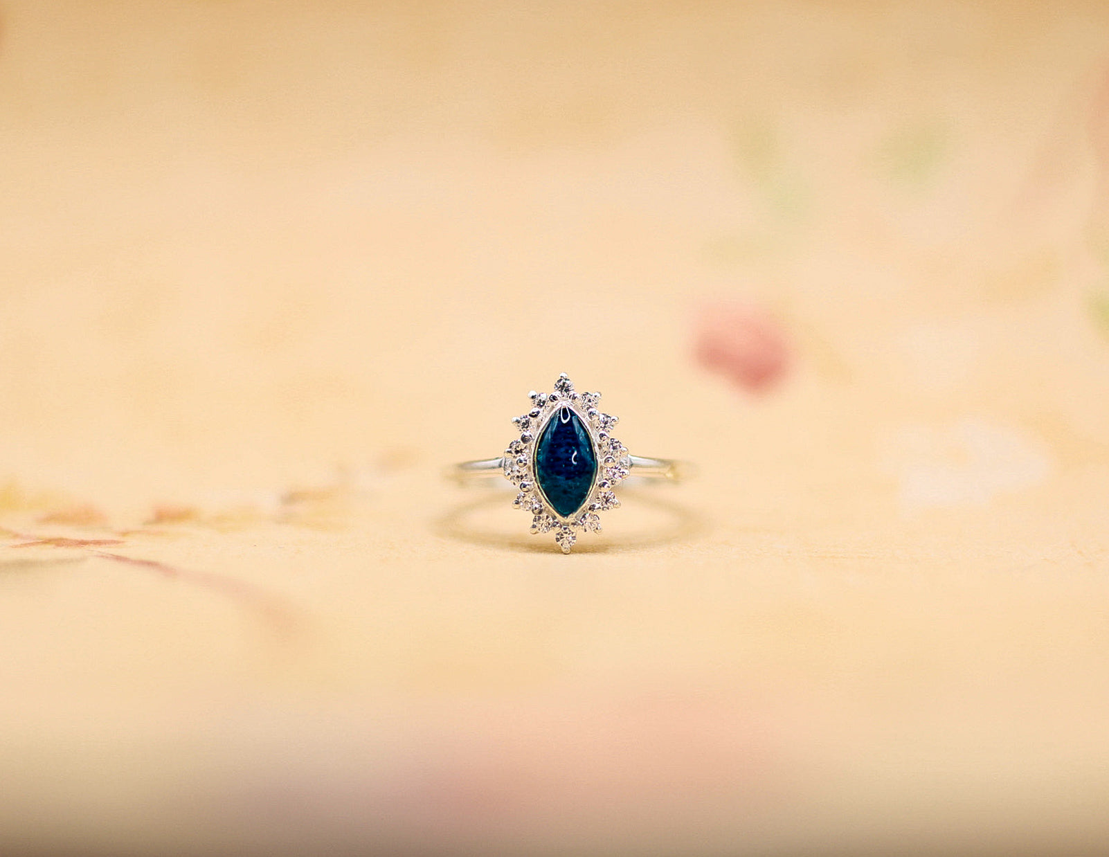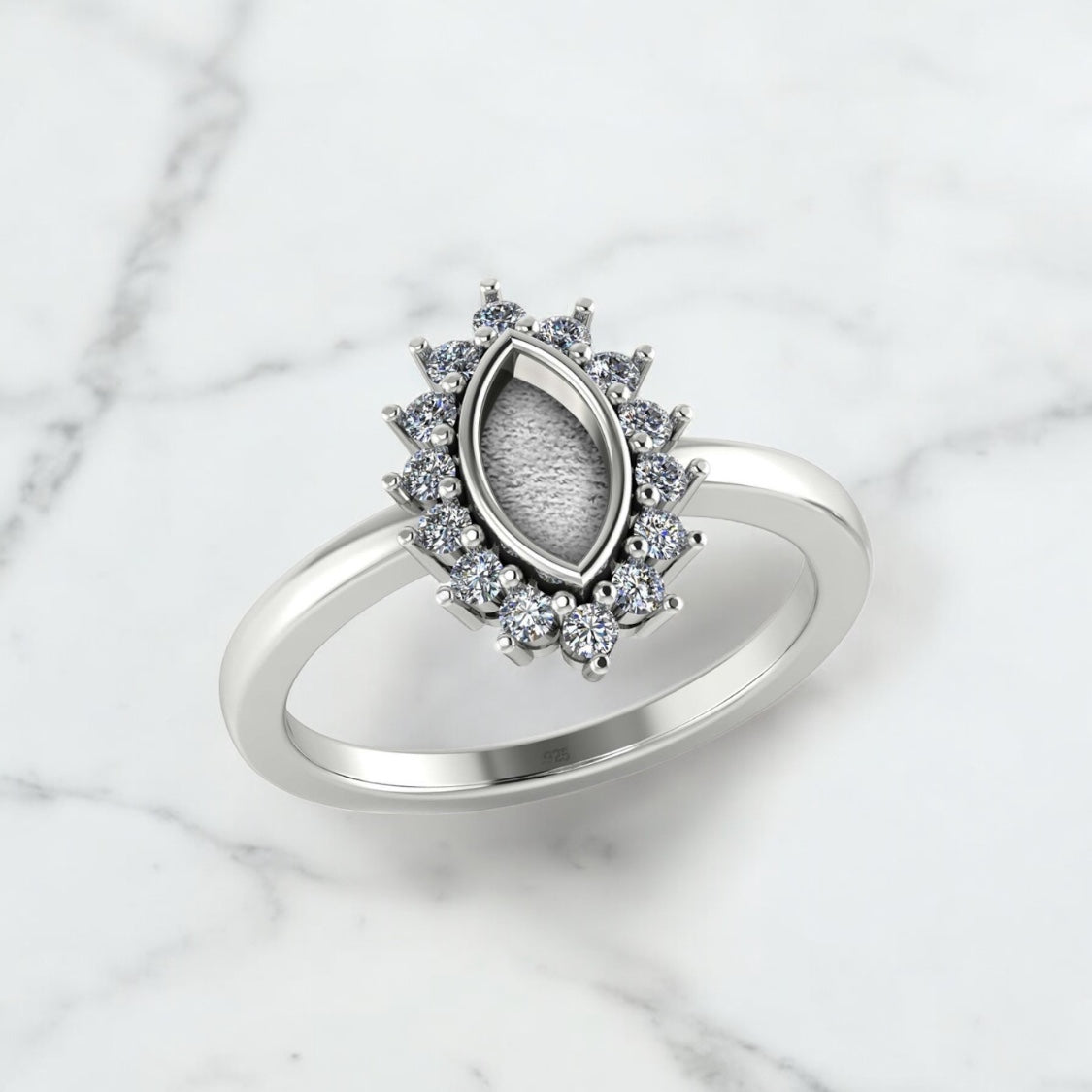 This timeless design features a vintage-inspired marquise center surrounded by a delicate halo of brilliant stones — capturing the elegance of 1950s and ’60s stage glamour with a shape that recalls both spotlight beams and the bold flash of rock ‘n’ roll.